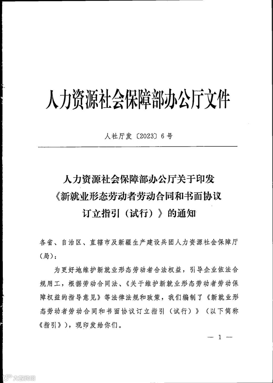 关于印发《新就业形态劳动者劳动合同和书面协议订立指引(试行)》的通知