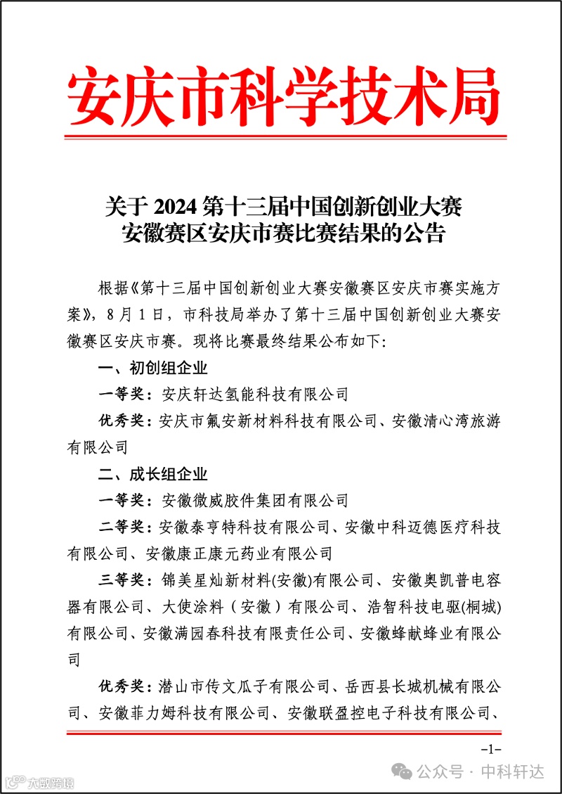 2024年8月1日,中科轩达受邀参加“第十三届中国创新创业大赛安徽赛区安庆市赛”。并通过自身的研发实力与技术优势在多家初创组企业的角逐中脱颖而出,荣获一等奖。