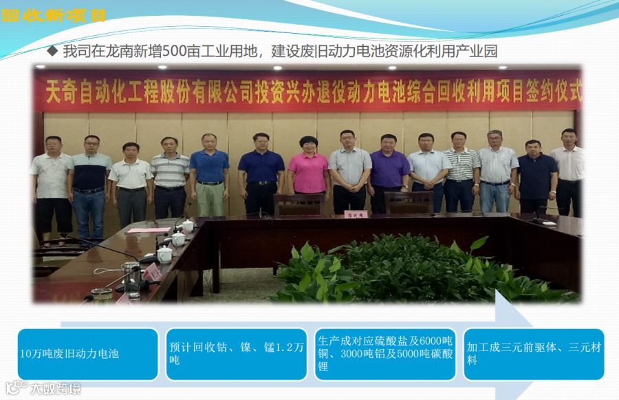 未来发展,以江西天奇金泰阁钴业有限公司作为基础,建设天奇废旧动力电池处理基地(500亩),项目已开始启动,计划三年完成。