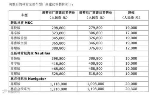 林肯下调建议零售价情况。