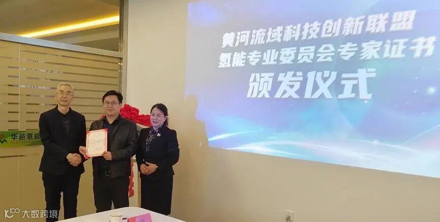 黄河流域科技创新联盟氢专委副秘书长张文良、侯志红为周飞鲲博士颁发了黄河流域科技创新联盟氢能专委会专家证书。