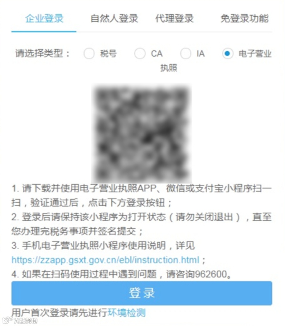 该模式支持四种登录方式,分别是税号登录、CA登录、IA登录和电子营业执照登录。
