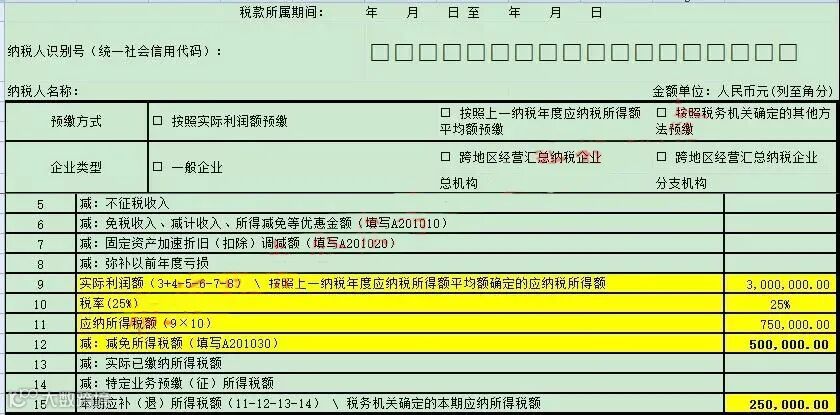 本行填报根据本期《中华人民共和国企业所得税月(季)度预缴纳税申报表(A类)》(A200000)第9行计算的减免企业所得税的本年累计金额。300万计算出来的减免企业所得税的金额就是50万。