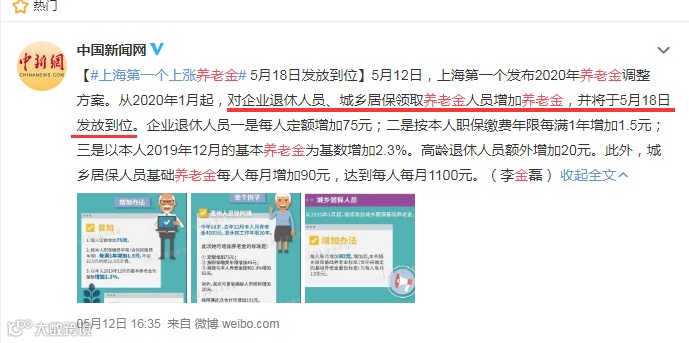 5月13日,中国新闻网官方微博发布称:上海第一个发布2020年养老金调整方案。从2020年1月起,对企业退休人员、城乡居保领取养老金人员增加养老金,并将于5月18日发放到位。