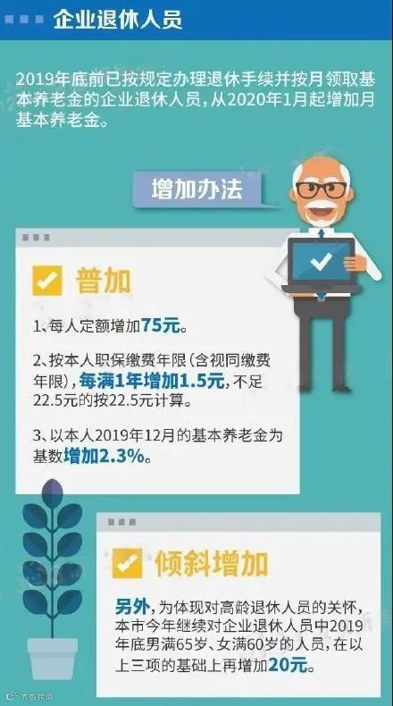 另外,企业退休人员中2019年底男满65岁、女满60岁的高龄退休人员,在以上三项的基础上再增加20元。