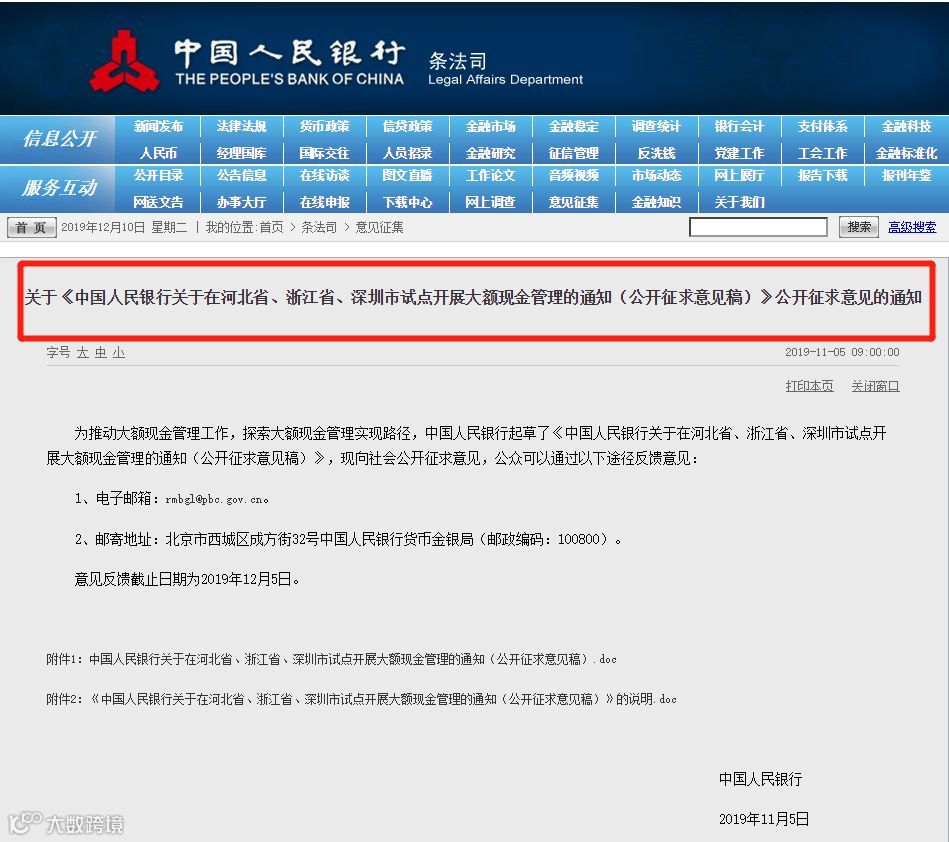去年,中国人民银行就发布《关于<中国人民银行关于在河北省、浙江省、深圳市试点开展大额现金管理的通知(公开征求意见稿)>公开征求意见的通知》释放了信号。