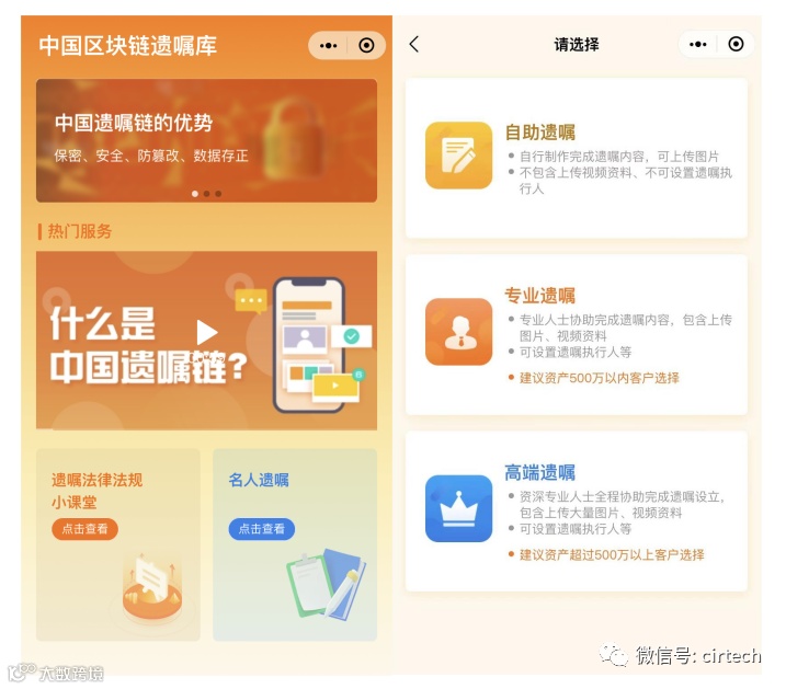 2023年5月18日,基于区块链技术的遗嘱小程序遗嘱星链正式上线,中国遗嘱链(遗嘱星链小程序)是由中铱数字科技有限公司联合国浩律师(南京)事务所共同发起的遗嘱服务项目。
