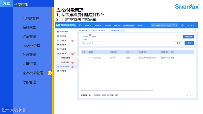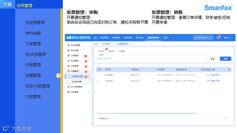 开票结算信息全靠线下沟通,采购对账效率低,供应商开票错误率高,三单匹配风险大, 跨部门沟通成本高。