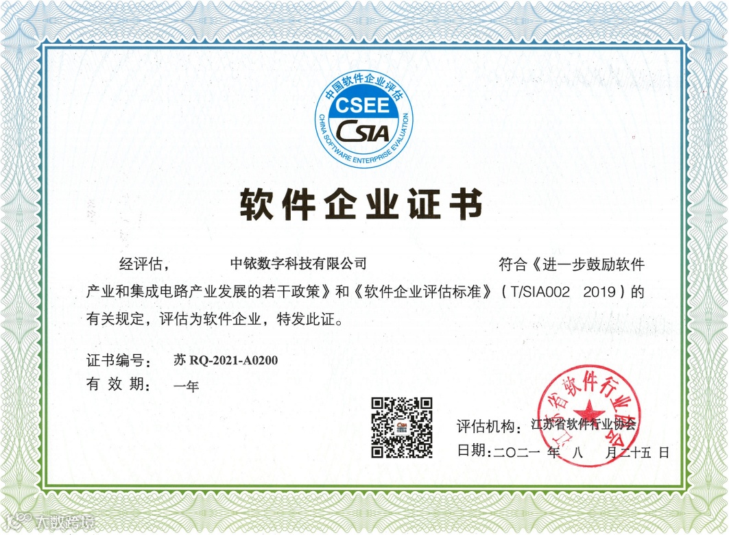 近日,中铱数字科技有限公司通过江苏省软件行业协会资质审核,荣获《软件企业证书》和《软件产品证书》(简称“双软证书”),这是对中铱数科研发能力与技术能力的极大肯定与信任。标志着中铱数科正式成为“双软资质认证”的企业。