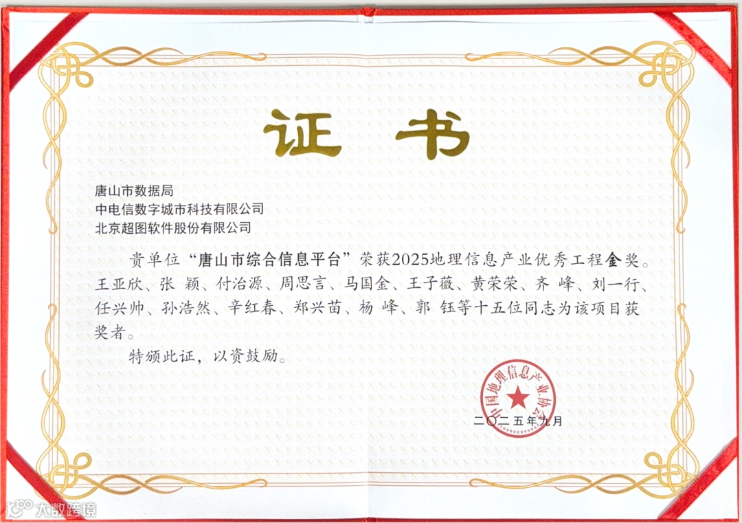 近日,2025年地理信息产业优秀工程评选结果揭晓,中电信数字城市科技有限公司协同中国电信唐山分公司承建的唐山市数据局综合信息平台,凭借突出的技术创新、科学的项目管理与显著的应用成效,在众多参评项目中脱颖而出,斩获地理信息产业优秀工程金奖。该奖项经国家主管部门备案认可,是地理信息产业工程领域的最高级别荣誉。此次获奖充分体现了中电信数城科技公司在技术创新、项目质量管控及成果应用价值转化等方面的卓越实力,也标志着该项目成为行业内的标杆典范。