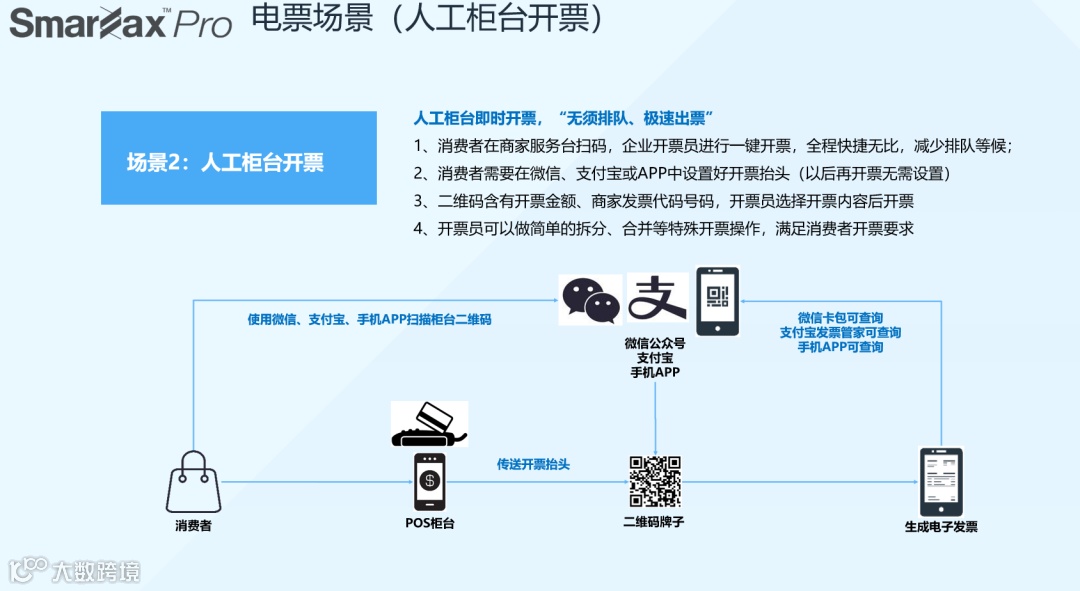 2)消费者自行开票:使用微信、支付宝、手机APP扫描小票二维码,二维码含有开票金额、商家发票代码号码,消费者执行一键开票,无需排队。