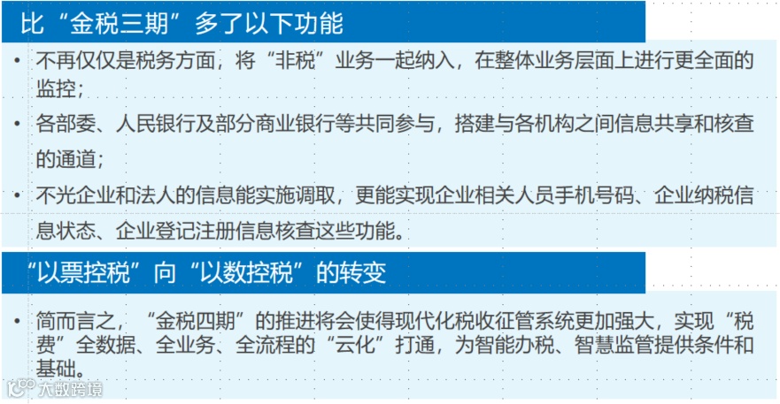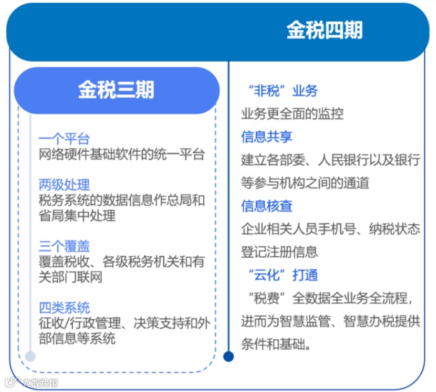 金税三期,实现了对国税、地税数据的合并及统一,其功能是对税务系统业务流程的全监控;而金税四期,不仅仅是税务方面,还会纳入“非税”业务,实现对业务更全面的监控。助力国家实现从“以票管税”向“以数治税”分类精准监管转变。