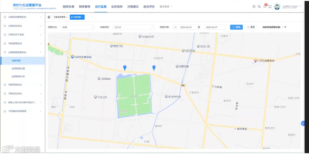 监测报警一张图:基于GIS地图实时展示监测报警与预测预警分布,支持模糊搜索、业务专题筛选、快速定位问题点位,实现监测报警信息的产生、审核、处置、复核等全生命周期闭环管理和监测报警的全景视图。