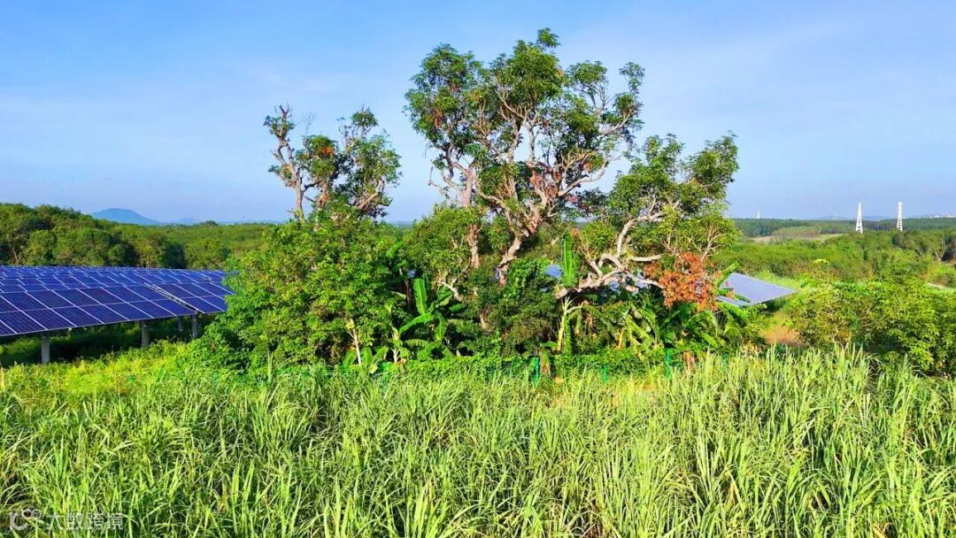 这里,是海南西部山海白沙昌江一带,素有“芒果之乡”的美誉。在漫山遍野的树林环绕中,渐渐展现出北京新能源公司海南白沙光伏项目成片成片的光伏板,而在光伏板的最西侧,醒目的苍翠繁茂的百年芒果树高高耸立,远眺之下,就像位“绿巨人”守护着这片绿色能源。