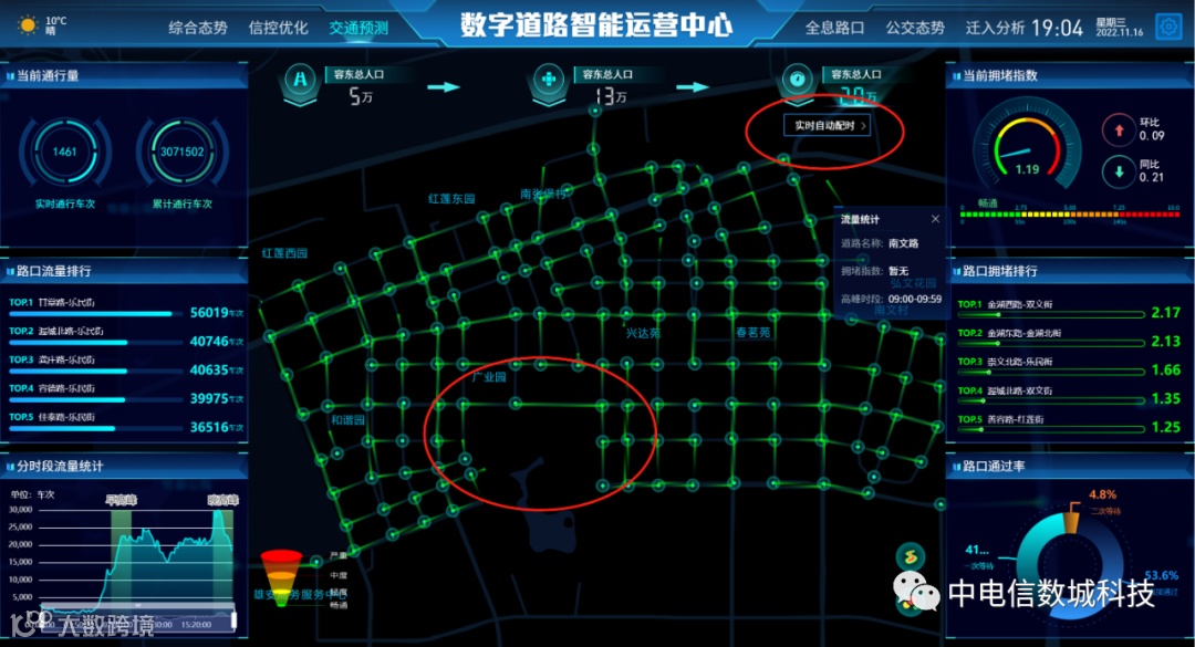 通过优化容东片区全域红绿灯配时策略,我们发现,这两个路口由浅黄色又转为绿色,整体拥堵指数从1.73下降到1.19,精准实现交通治理,保证了未来容东仍不堵车。