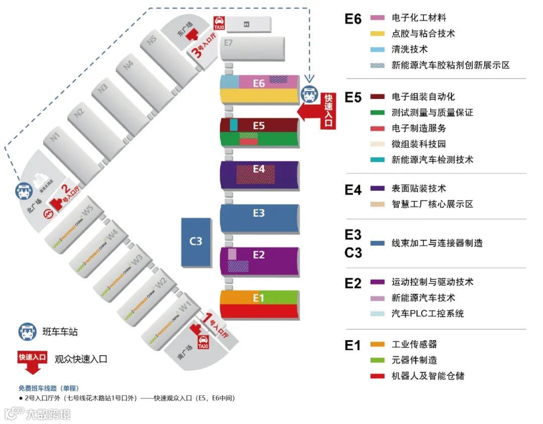 1. 乘坐地铁7号线,至终点站花木路站,从1号口出地铁站,乘坐馆外免费班车直达观众快速入口(E5与E6中间),直接参观慕尼黑上海电子生产设备展