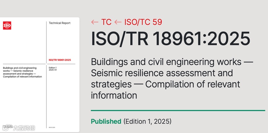 由中国提出,中国建筑标准设计研究院有限公司与清华大学、 北京建筑大学联合编制的首部地震韧性领域国际标准化文件 ISO/TR 18961:2025 Buildings and civil engineering works — Seismic resilience assessment and strategies — Compilation of relevant information(中文:建筑和土木工程—地震韧性评估和策略 —相关信息汇编)于2025年1月7日正式发布,是全球首部地震韧性领域国际标准化文件,是建筑和土木工程韧性领域的重要成果。