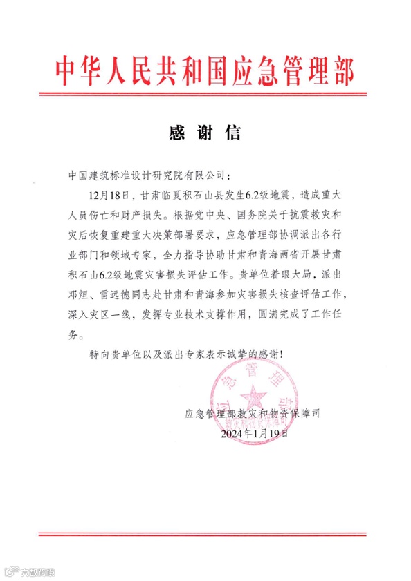 近日,中国建筑标准设计研究院有限公司(以下简称标准院)收到中华人民共和国应急管理部感谢信,对邓烜、雷远德同志附甘肃和青海参加灾害损失核查评估工作表示感谢。在甘肃临夏积石山县发生6.2级地震后,两位同志不顾震后环境恶劣,深入灾区一线积极开展灾害损失核查评估工作,为灾后损失评估工作提供了专业技术支撑。在核查的各项工作中展现了优秀的工作能力、务实作风,获得了高度评价和认可。