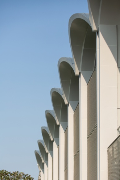 设计采用拱形单元结构,将大体量体育功能化整为零,较大尺度的体育空间以较小尺度的外立面呈现,形成一定的节奏韵律。建筑在满足基本使用需求的同时,能够更好地融入周边环境,使建筑与园博园整体空间和谐共生。