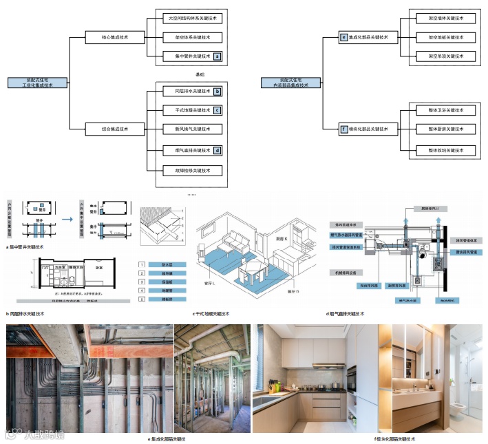 装配式住宅体系以建筑工业化生产建造为基础,以建筑产品为最终形态,需要以产品化思维从产业整合和技术集成的角度思考解决方案,实现以居住者体验为中心的高质量成品交付。这也决定了装配式住宅体系从设计思维到流程都不再是以设计主导,而是以设计集成策略主导。设计集成通常采用开放性的建筑体系,体系内部各系统随设计进程优化内部关系,对要因进行梳理和整合,实现集成设计的优化和升级。装配式住宅体系设计建造通用体系就是以系统工程的思维与方法为指导,实现主体结构、外围护、设备管线与内装的系统集成。其系统集成还体现在协同建筑、结构、机电和装修等全专业集成,统筹策划、设计、生产、施工和运维等全过程集成(图7)。[10]研发攻关我国新型住宅工业化的装配式建筑通用体系及集成技术,既可扭转粗放的生产建造模式,也从根本上解决了住房的质量问题,提高了住房的综合性能。探索研发住宅干式工法、部品整合、集成技术,通过科技创新促进科技成果转化,并在大量项目中落地实践(图8)。