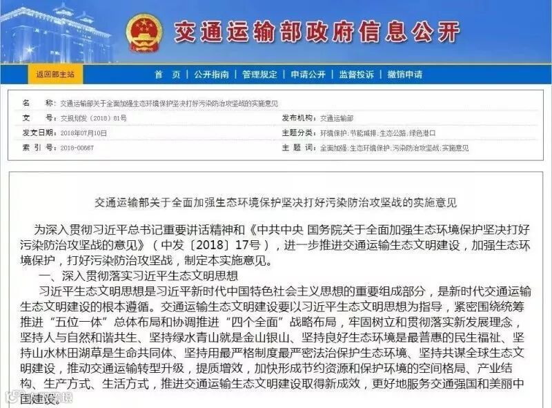 2018年7月10日,交通运输部下发《关于全面加强生态环境保护坚决打好污染防治攻坚战的实施意见》。