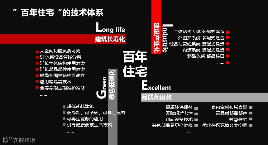 “中国百年住宅”是以可持续居住环境建设理念为基础,力求通过建设产业化,全面实现建筑的长寿化、品质的优良化、绿色低碳化,通过保证住宅性能和品质的规划设计、施工建造、维护使用、再生改建等技术为核心的新型工业化体系与集成技术,以建设提高居住长久价值的人居环境。“中国百年住宅”是以建筑产业化的生产方式建设的长寿化、高品质、低能耗的新型可持续住宅。