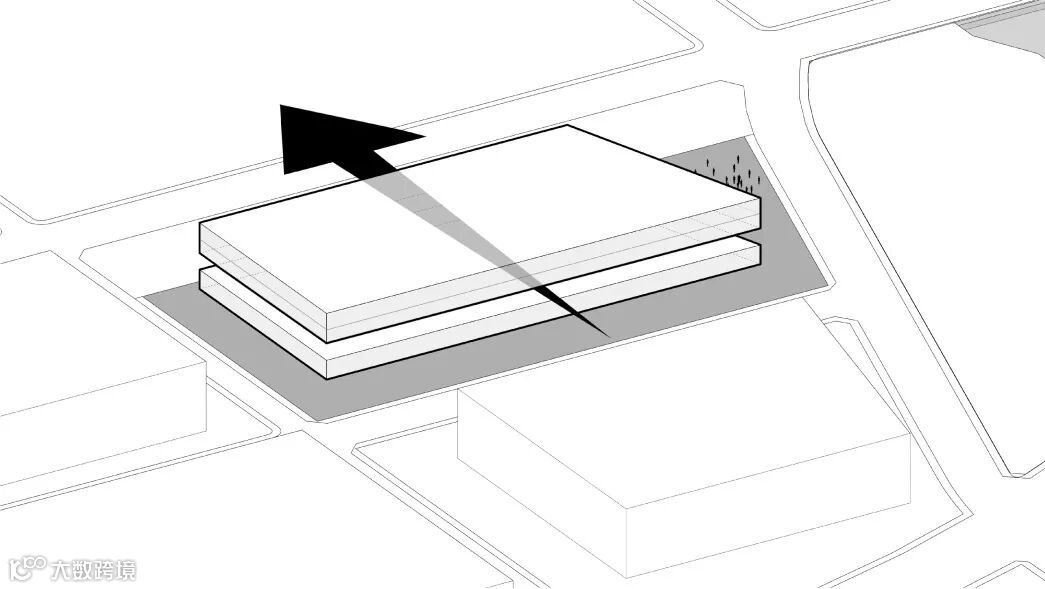 建筑形体充分利用场地空间。建筑形态水平分化,可分为上下两部分。上部为生活训练区,指挥中心及市民参观,下部为消防救援业务区。