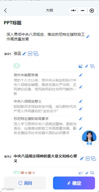在生成大纲界面插入合适的图片(每章节最多支持三张图片上传);文档内容生成的PPT大纲可进行编辑,大纲修改的越符合思路,生成内容就会更倾向您的要求