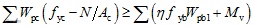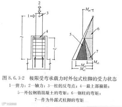 3. 抗震设计时,在外包混凝土顶部箍筋处,柱可能出现塑性铰的柱脚极限受弯承载力应大于钢柱的全塑性受弯承载力(图8.6.3-2)。柱脚的极限受弯承载力应按下列公式验算: