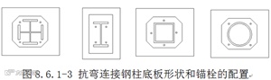 4.钢柱柱脚的底板均应布置锚栓按抗弯连接设计(图8.6.1-3),锚栓埋入长度不应小于其直径的25倍,锚栓底部应设锚板或弯钩,锚板厚度宜大于1.3倍锚栓直径。应保证锚栓四周及底部的混凝土有足够厚度,避免基础冲切破坏;锚栓应按混凝土基础要求设置保护层。