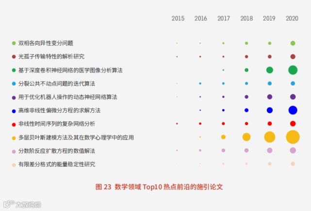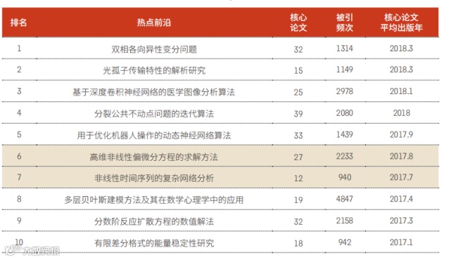 数学领域位居Top10的热点前沿主要集中于双相各向异性变分问题、光孤子传输特性的解析研究、基于深度卷积神经网络的医学图像分析算法等,统计学领域的非线性时间序列的复杂网络分析首次入选。
