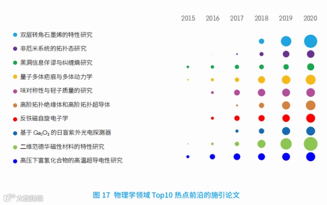 Top10的热点前沿主要集中于凝聚态物理、高能物理、理论物理和光学。