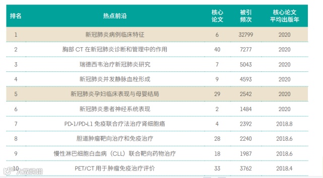 Top10 热点前沿集中于新型冠状病毒肺炎(COVID-19,简称新冠肺炎)、肿瘤免疫与靶向治疗两个前沿群。