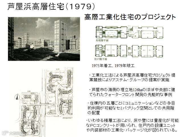 这是1979年在神户的一个项目,它是一个超高层建筑,这是在工厂里将做好的钢筋混凝土装进钢框架结构里的预制板材的全新构法。大量提供高品质房屋的政策下,日本建筑的设计和技术得到长足的发展,这样一个新的构法出来之后终于能够提供大量的房屋,但是这时,日本的房屋已经饱和了,甚至还会剩余。