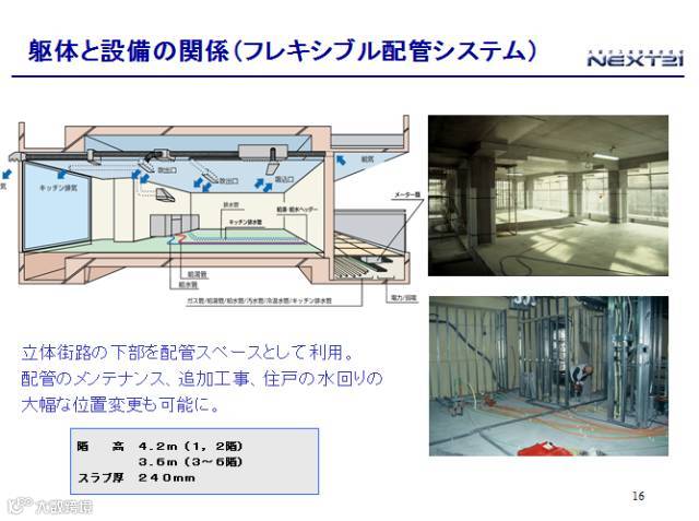 还有就是,外墙进行移动的实验结果。后边也有几张施工图,不给大家一一讲述,NEXT 21的实验,大家可以去参观,是日本比较先进的集合住宅。刚才说实验建筑投入市场造价太高,不太适合。日本大量的房地产商正在对有实现可能的长寿命化住宅进行各种尝试。穿过一些管线,管线的位置是固定好的。地板下面留出一些空间,可以自由地进行走管。还有一个竖式的,其他连接到住户各个房间的管是比较自由的。还有刚才为了走管线地板稍微太高了一些,觉得空间被缩小了,吊顶的电线直接贴在顶面上节省了一些空间出来。