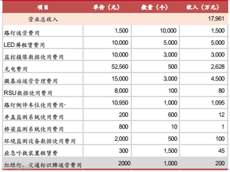 其次是项目营收的测算,主要有来自政府及相关部门支付的路灯、监控、信号灯、WIFI热点、井盖监测、桥梁监测、环境监测、应急呼救等租赁使用费和运营商支付的基站租赁费用、车联网支付RSU数据使用费用、消费者支付充电费用。