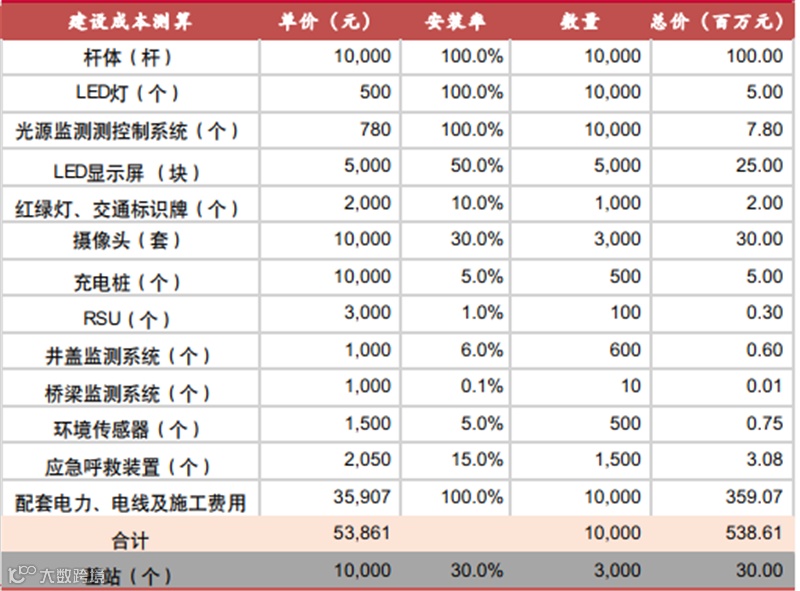 以10000根灯杆为例,进行运营业务规模测算。首先,参考落地项目对智慧灯杆建设成本进行测算。预计总成本为5.39亿元,平均建设成本为每杆5.39万元。