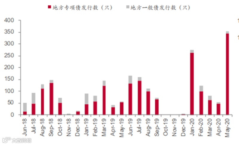 2020年1-5月累计发行地方专项债818只,同比增发506只;累计地方专项债发行额为21697.92亿元,同比增长148.45%;地方专项债占地方债比例也从2019年1-5月的55.25%上升至79.41%。