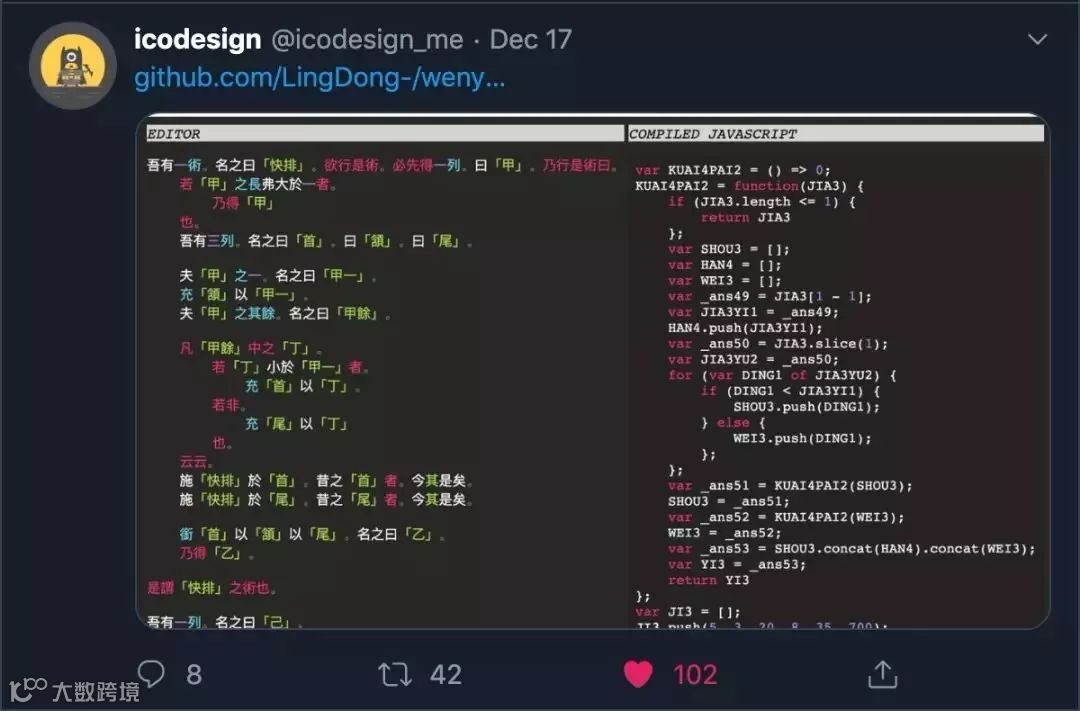 最近刷微博、朋友圈、公众号,发现大家都被一个文言文编程的项目圈粉了。
