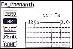 5. 此时光标定位在ZERO图标上,按下OK键,进行空白样检测,屏幕上会显示含有180S和ppm Fe的图表,表示空白样检测完毕。