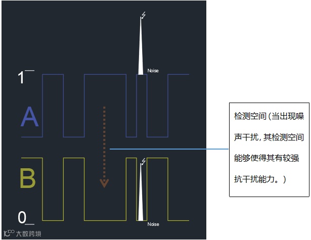 由于是差分信号,在有干扰出现的情况下,其抗干扰能力较强。如下图。