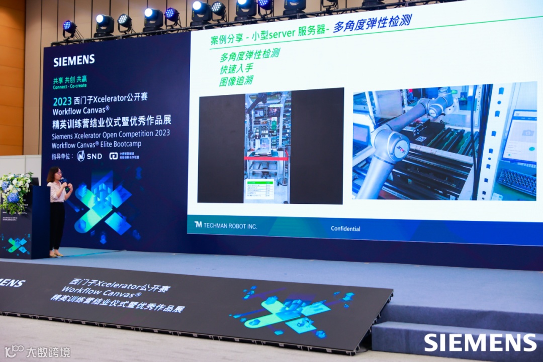 9月1日,西门子Xcelerator Workflow Canvas(工易魔方)生态合作伙伴大会-精英训练营优秀作品展览的专题路演环节,达明机器人(上海)有限公司客户总监李珍珍发表了主题为《AI技术赋能协作机器人》的演讲,介绍了达明机器人的企业发展历程以及产品的创新之路,重点讲解了达明机器人AI视觉的优势特点与应用场景。