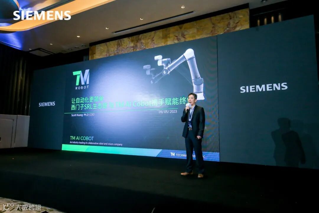 同期9月5日,达明机器人全球首席运营官-黄识忠博士出席了2023西门子SIMATIC机器人生态大会,与相关专家进行了技术分享,并发表了主题为《让自动化更简单:西门子SRL生态链与TM AI Cobot携手赋能终端》的演讲。