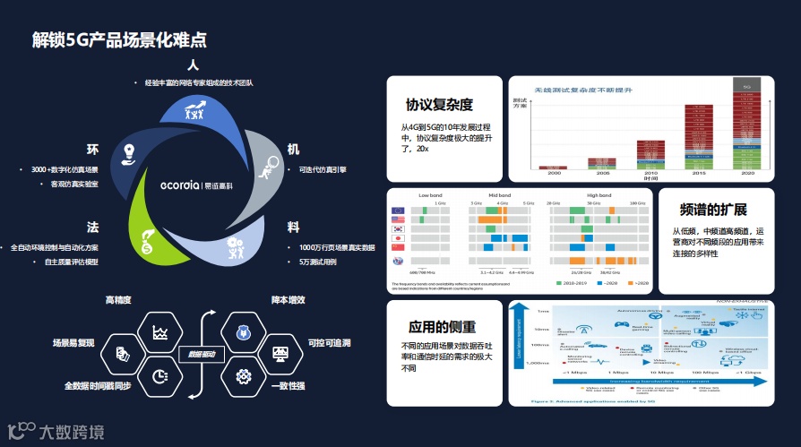 那么针对5G产品场景化中的难点,我们是建立了一个“人-机-料-法-环”这样的闭环。通过与索尼、高通等大客户合作积累行业头部技术经验,易诚高科目前已经具备完善的测试设备和场景。