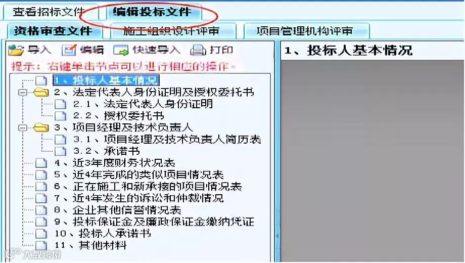3.编辑资格审查文件,根据招标文件要求,在word中编制好资格审查文件内容。选择【编辑投标文件】页签,在下方的窗口中选择【资格审查文件】页签中对应标题的文件名称内容节点,点击【导入】按钮导入已编辑的资格审查文件;