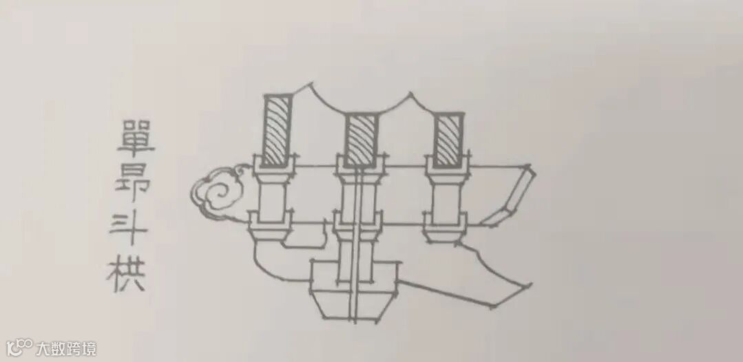 单昂三踩斗拱是进深方向构件,在大斗之上为昂(昂上为耍头),从正心向内外各出一踩,共三踩的斗拱。明清出踩斗拱中桃出最小的斗拱。