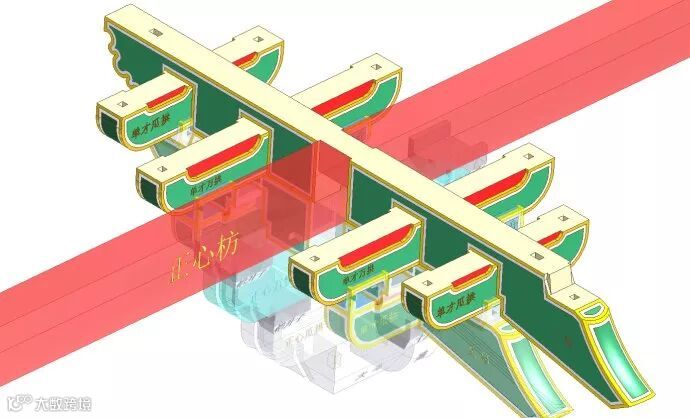 正心枋,它既不是斗件也不是拱件,宋《营造法式》中的造拱、造斗之制没提到它。但它与斗拱在大木建筑中同时出现,所以大多将其列入斗拱的附属件。《清式营造则例》说“正心枋。长按面阔,高按一踩,厚按一个半口数。其层数,自斗口二踩以上用,再至撑木头上皮,每一踩得一层。”