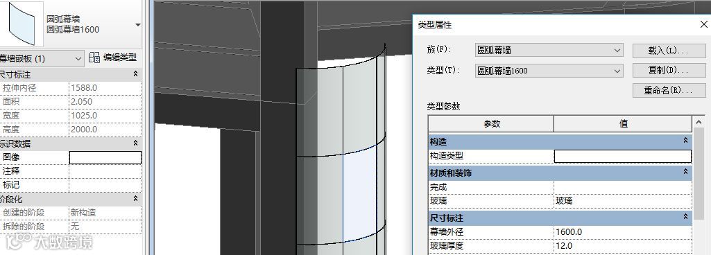 起始我们对幕墙外径设置了实例参数,载入项目发现不能直接读取幕墙半径,所以对其设定为类型参数。