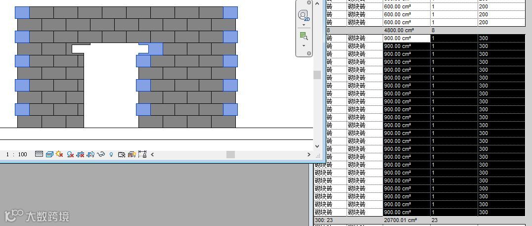 但是,上面已经介绍,由于对砌块族设置了共享,则在项目中就可以统计砌块的相关信息,统计的是幕墙嵌板。图中所示的就是所有标准砌块的数量及在项目中的位置。