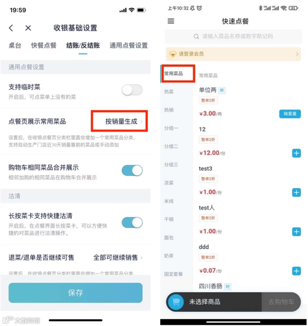 在智掌柜商户端,点餐页展示常用菜品可设置为不展示常用菜品、按销量展示常用菜品、手动设置常用菜品,商户可按需设置。